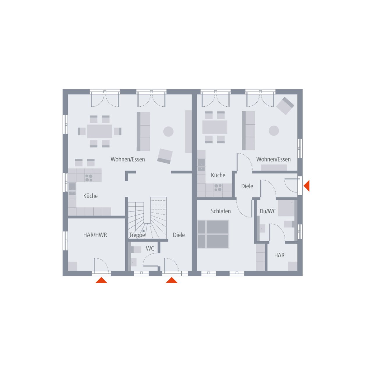 Unter dem Walmdach bieten zwei achsensymmetrische Haushälften unbeschwertes und exklusives Wohnen. Die durchdachte Grundrissgestaltung eignet sich sowohl für Familien mit Kindern als auch für Paare, die Zusatzräume für Home-Office, Hobby oder Gäste benötigen. Das Erdgeschoss ist in einen Nutz- und den großflächigen Wohnbereich mit offener Küche unterteilt. Der mittige Fassadenvorsprung sorgt für trockenen Zutritt und lockert die geradlinige Architektur ansprechend auf. Im Obergeschoss stehen das Schlafzimmer, ein Wellnessbad sowie zwei weitere Zimmer für individuelle Raumaufteilung zur Verfügung.