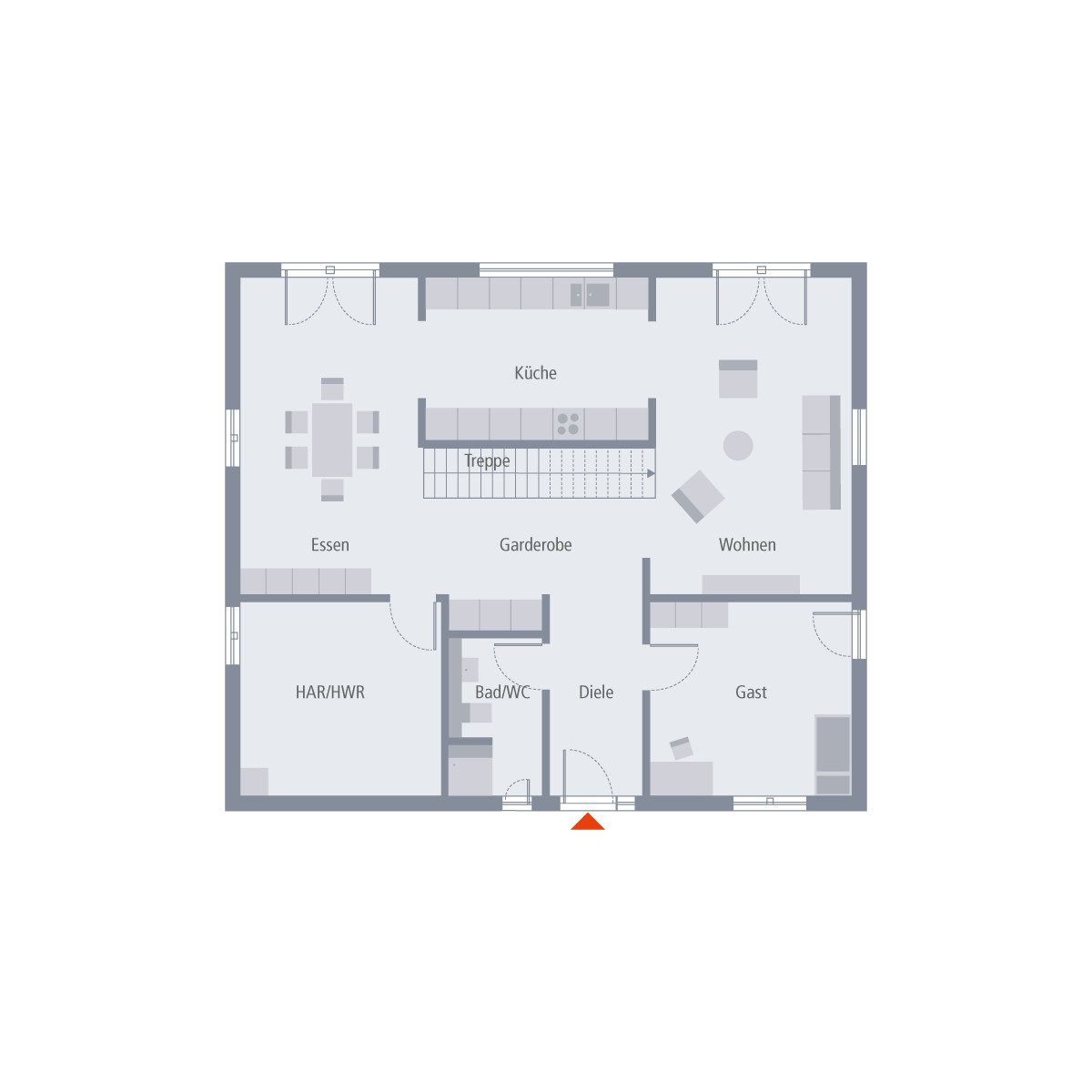 Das Design 19.1 ist der Traum jeder Großfamilie. Vier Kinderzimmer stehen im Obergeschoss zur Verfügung und bieten viele Möglichkeiten der Gestaltung. So können hier beispielsweise vier Schlafzimmer, aber auch eine Variante aus Schlaf- und Spielzimmer entstehen. Das Elternschlafzimmer sowie ein geräumiges Bad mit Badewanne und Dusche runden das Raumangebot in dieser Etage ab. Viele Räume, aber keine beengten Verhältnisse, denn alle Familienmitglieder haben dank der cleveren Raumaufteilung rund 16 m2 Platz zum Leben, Schlafen und Entspannen. Komfortabel gestaltet sich auch das Erdgeschoss, das durch seine besondere Aufteilung besticht. In den Wohn-Ess-Bereich integriert und doch räumlich abgetrennt liegt die Küche als Mittelpunkt dieser Ebene. Das verleiht den Räumen ein ganz besonderes Flair – offen und doch gemütlich. Ein weiteres großes Zimmer, das beispielsweise für Gäste oder als Büro genutzt werden kann, ein Hauswirtschaftsraum sowie ein Gäste-WC befinden sich ebenfalls im Erdgeschoss.
