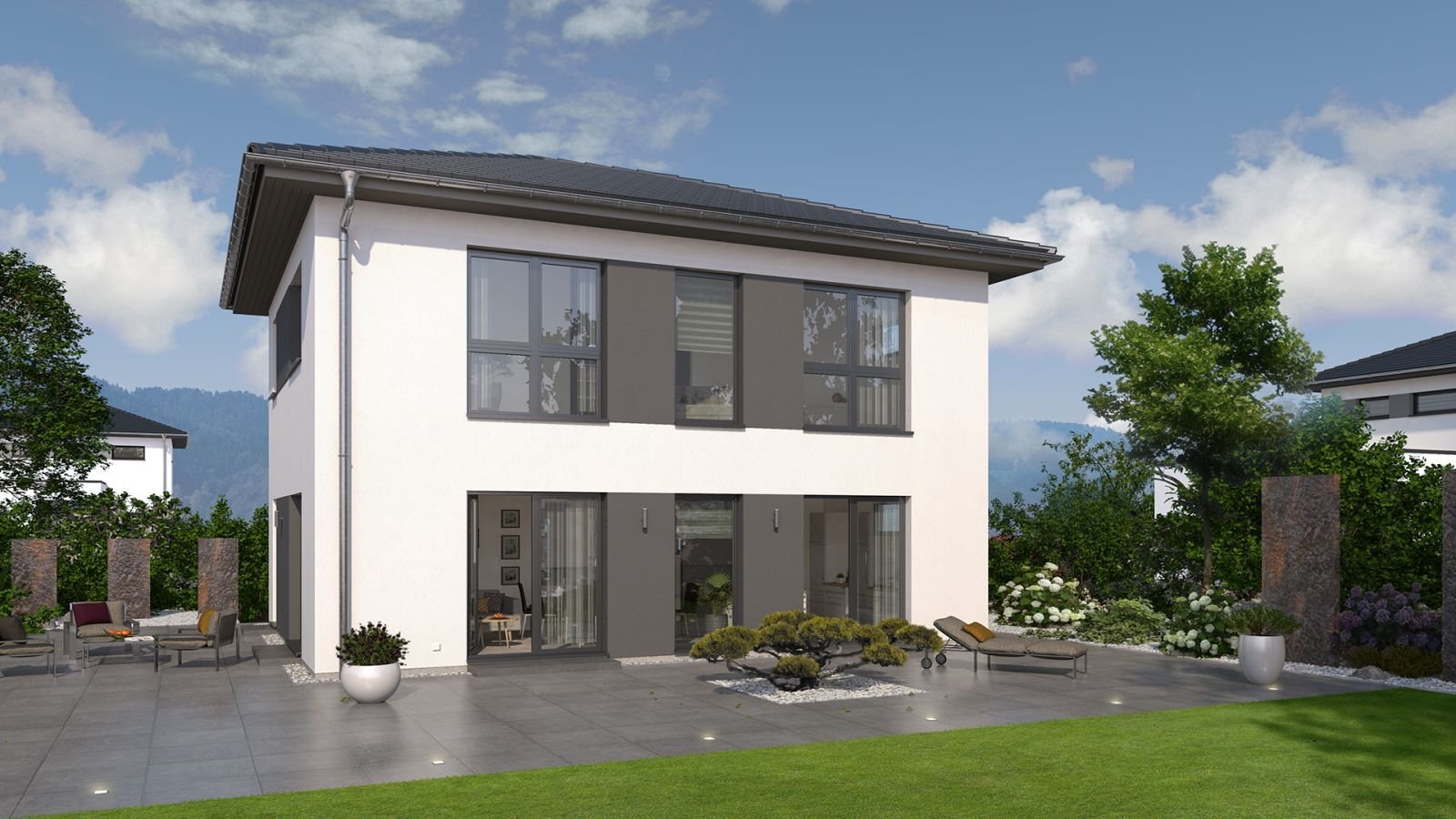 Ein Walmdach, das verkörpert Eleganz und vermittelt einen edlen, fast schon herrschaftlichen Eindruck. So auch bei unserer Stadtvilla 10 mit Walmdach. Das große Plus: Dank dieser Dachform gibt es im Obergeschoss keine Dachschrägen und damit zahlreiche Möglichkeiten zum Positionieren der Möbel. Doch diese Stadtvilla kann noch mit vielen weiteren kleinen und großen Ausstattungs- und Grundrissdetails punkten. So gibt es im ca. 78 m2 großen Erdgeschoss eine räumliche Zweiteilung: die Zimmer zum Entspannen und Zusammenkommen auf der Gartenseite, die funktionellen Räume auf der, der Straße zugewandten, Seite. Konkret bedeutet das: vom großen Wohn-Ess-Koch-Bereich ist der direkte Zugang auf die Terrasse und damit ins Grüne möglich. Büro, Hauswirtschaftsraum sowie Gäste-WC sind unterdessen gegenüberliegend und unmittelbar aus der Diele zugänglich. Im Obergeschoss befinden sich neben dem Reich der Eltern zwei identisch große Kinderzimmer sowie ein geräumiges Bad mit Wanne, Dusche und WC.