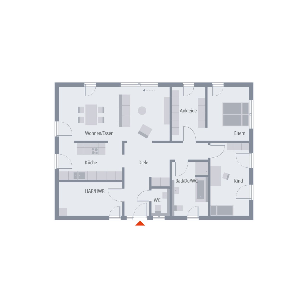 Auf 107 m² bietet dieser Bungalow alles, was eine Familie zum Wohlfühlen braucht. Im offenen Wohn- und Essbereich spielt sich das Leben ab – hell, freundlich und mit drei Glastüren, die den Garten zum Teil des Zuhauses machen. Die angrenzende Küche ist offen und praktisch, hier darf gemeinsam gekocht und gelacht werden. Der Hauswirtschaftsraum mit Zugang von außen erleichtert den Alltag und hält Schmutz draußen. Ein Elternbereich mit Ankleide, ein sonniges Kinderzimmer, ein Bad mit Wanne und Dusche sowie ein Gäste-WC machen das Familienglück komplett.
