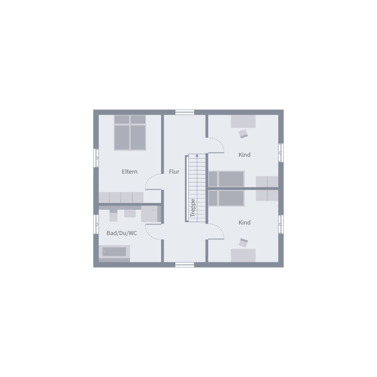 Das Design 10.2 steht für modernes Wohnen mit Charakter. Auf 140 m² verbindet sie Design und Alltag auf harmonische Weise. Der offene Wohn- und Essbereich bildet das Herzstück – hell, großzügig und mit einer geraden Treppe, die als Designelement den Raum gliedert. Büro, Gäste-WC, Hauswirtschaftsraum und Speisekammer machen das Erdgeschoss ebenso funktional wie stilvoll. Im Obergeschoss empfängt ein lichtdurchfluteter Flur, der zu den privaten Rückzugsorten führt: ein Elternzimmer, zwei Kinderzimmer und ein großzügiges Familienbad. Unter dem klassischen Satteldach entsteht ein Zuhause, das Ästhetik und Geborgenheit vereint.