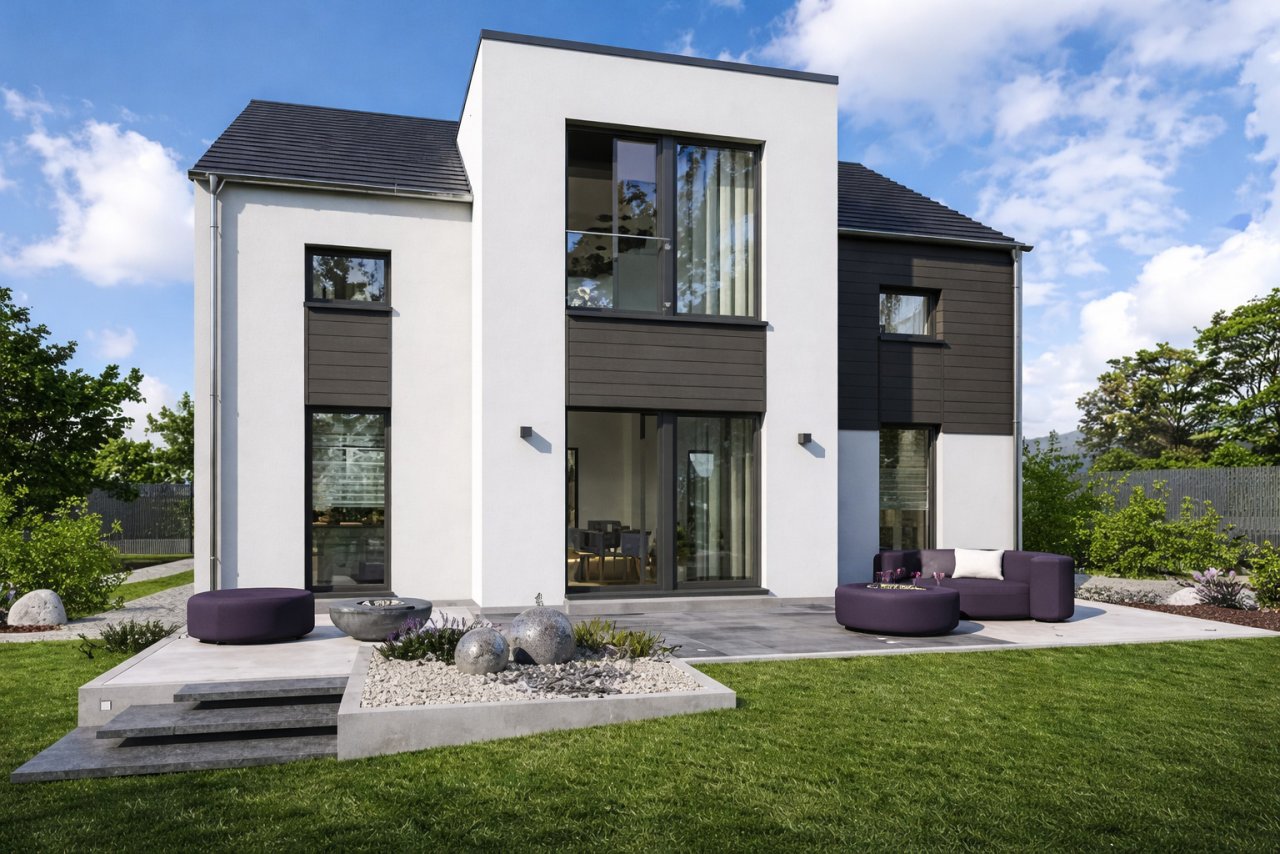 Aha-Effekte außen, Aha-Effekte innen. Das Haus Design 22 besticht nicht nur durch seine außergewöhnliche Optik, sondern in gleichem Maße durch seine bis ins kleinste Detail durchdachte Architektur. Das beginnt bereits bei der Fassadengestaltung: Der moderne Erker auf der Rückseite des Hauses ist nicht nur ein echter Hingucker, die großen, bodentiefen Fenster sorgen zudem im Inneren für lichtdurchflutete Räume und ein besonderes Gefühl von Größe. Innen- und Außenbereich verschmelzen optisch miteinander. Der Wohnbereich im Erdgeschoss besticht durch die Größe und Offenheit. Neben dem Wohn-Ess-Kochbereich und der offenen Diele gibt es hier Garderobe, Hauswirtschaftsraum, Gäste-WC sowie ein Arbeitszimmer. Ein weiteres Highlight auf rund 180 m² Wohnfläche ist die zentral gelegene Treppe und die dadurch im Obergeschoss entstehende Galerie. Hier oben finden zudem die Eltern in einem Schlaf- und einem Ankleidebereich, sowie bis zu zwei Kinder, Platz. Ein großes Bad rundet das Raumangebot im Obergeschoss ab.