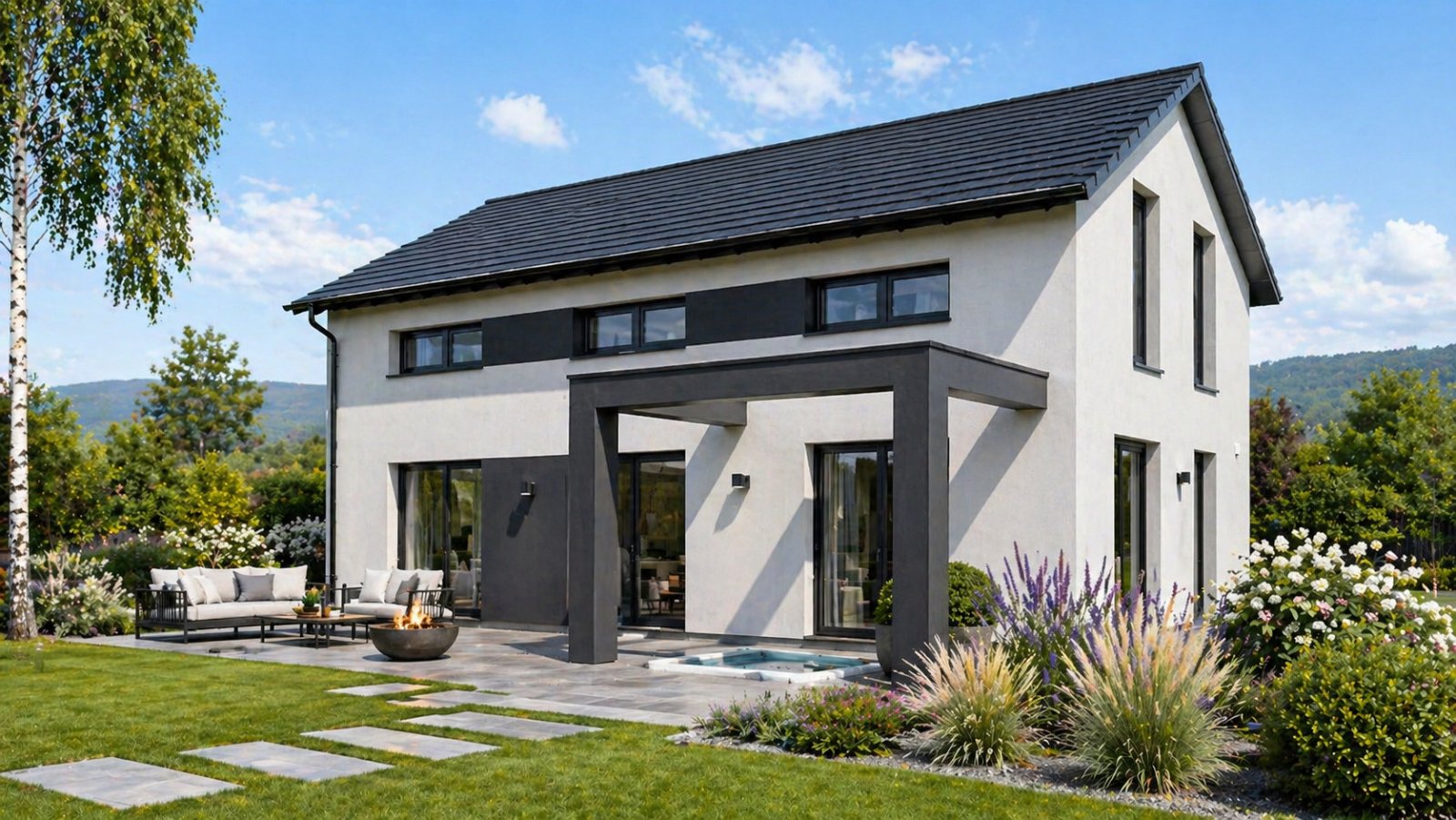 Das Design 5 bietet Ihnen viel Raum, um Ihre Wohnträume zu verwirklichen. Auf etwa 162 m² stehen Ihnen zahlreiche Nutzungsmöglichkeiten zur Verfügung. Der großzügige Wohn-, Ess- und Küchenbereich bildet das Herzstück des Familienlebens. Von hier aus ermöglichen Terrassentüren den direkten Zugang ins Freie und sorgen zudem für lichtdurchflutete Räume. Ein 11 m² großer Hauswirtschaftsraum, eine direkt an die Küche angrenzende Speisekammer sowie ein Gäste-WC vervollständigen das Angebot im Erdgeschoss. Eine einladende Treppe im Flur führt ins Obergeschoss, wo neben einem Elternschlafzimmer und einem Bad noch drei weitere Räume verfügbar sind: Kinderzimmer, Büro oder Gästezimmer - Ihrer Kreativität sind keine Grenzen gesetzt.
